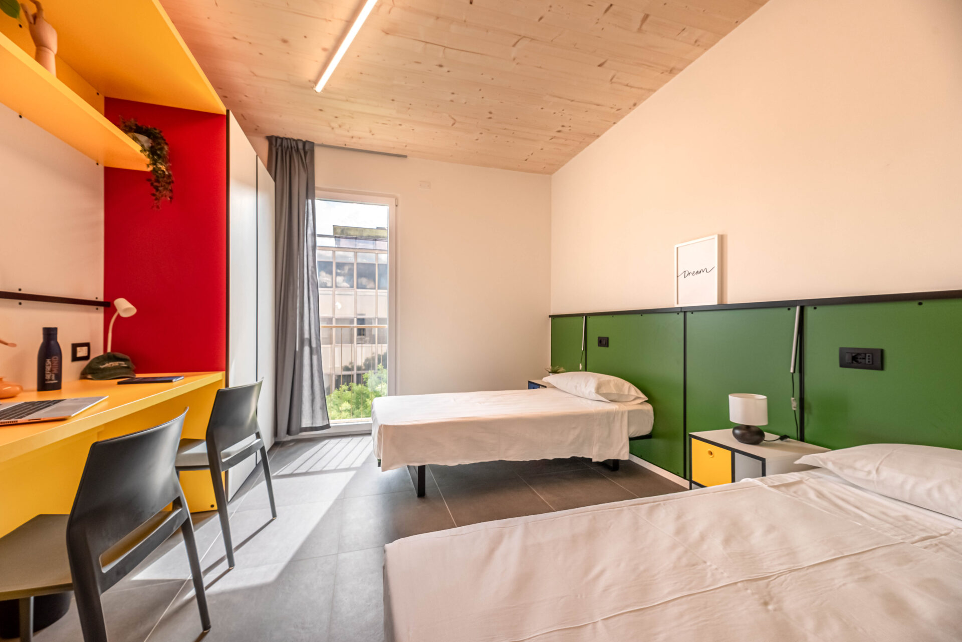 The residence offers 230 beds in single and double rooms, designed to ensure maximum comfort and functionality. All rooms feature a private bathroom, an internal kitchenette with induction cooktops, a refrigerator, a microwave, and pantry spaces. The furnishings are of high quality and include everything necessary for student life away from home.